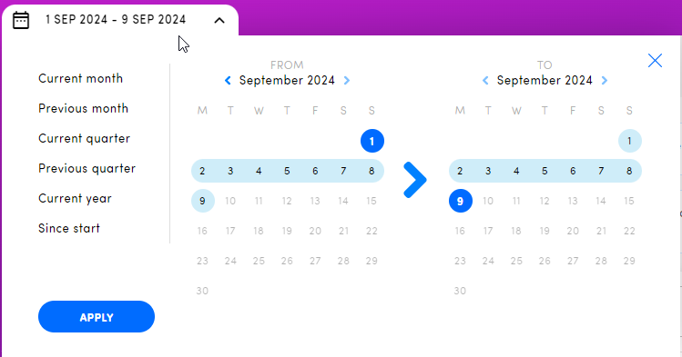 - User opens the platform again the next day and goes to a touchpoint. When opening the date picker, "current month" is selected, since this is the last default period that was chosen in the date picker.