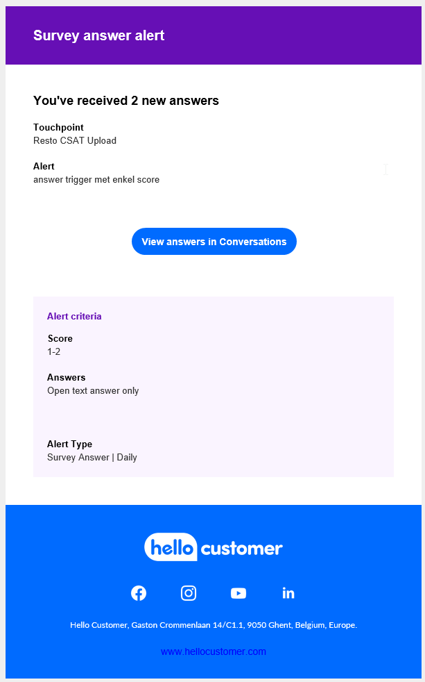 When clicking the button View answers in Conversations, you are redirected to the conversations section of your environment with preselected filters, so the correct conversations linked to this notification are shown.