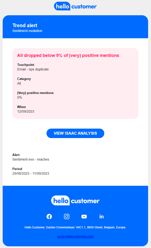 Clicking on the button VIEW ISAAC ANALYSIS will lead you to the ISAAC analysis of the correct metric within touchpoint of the alert with the correct date range.