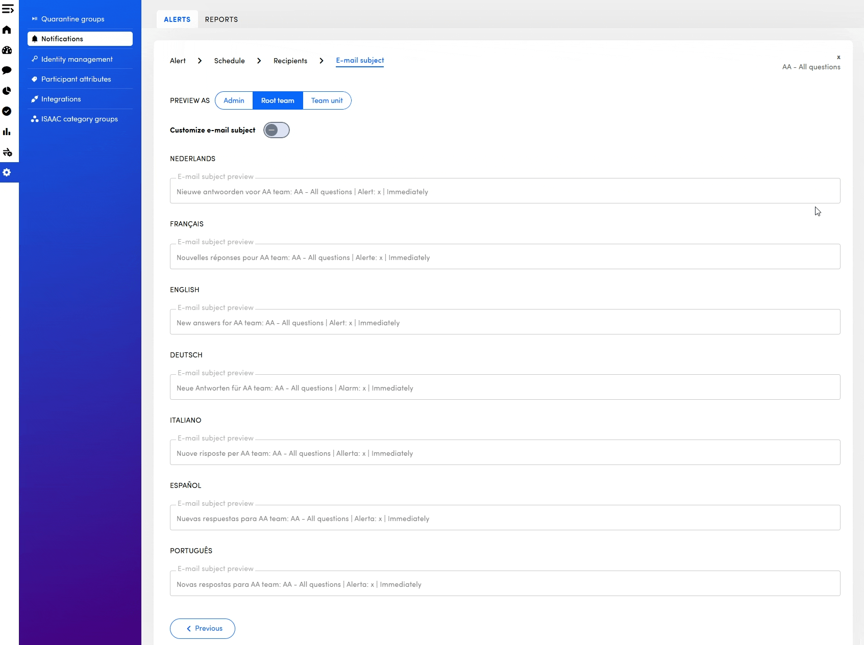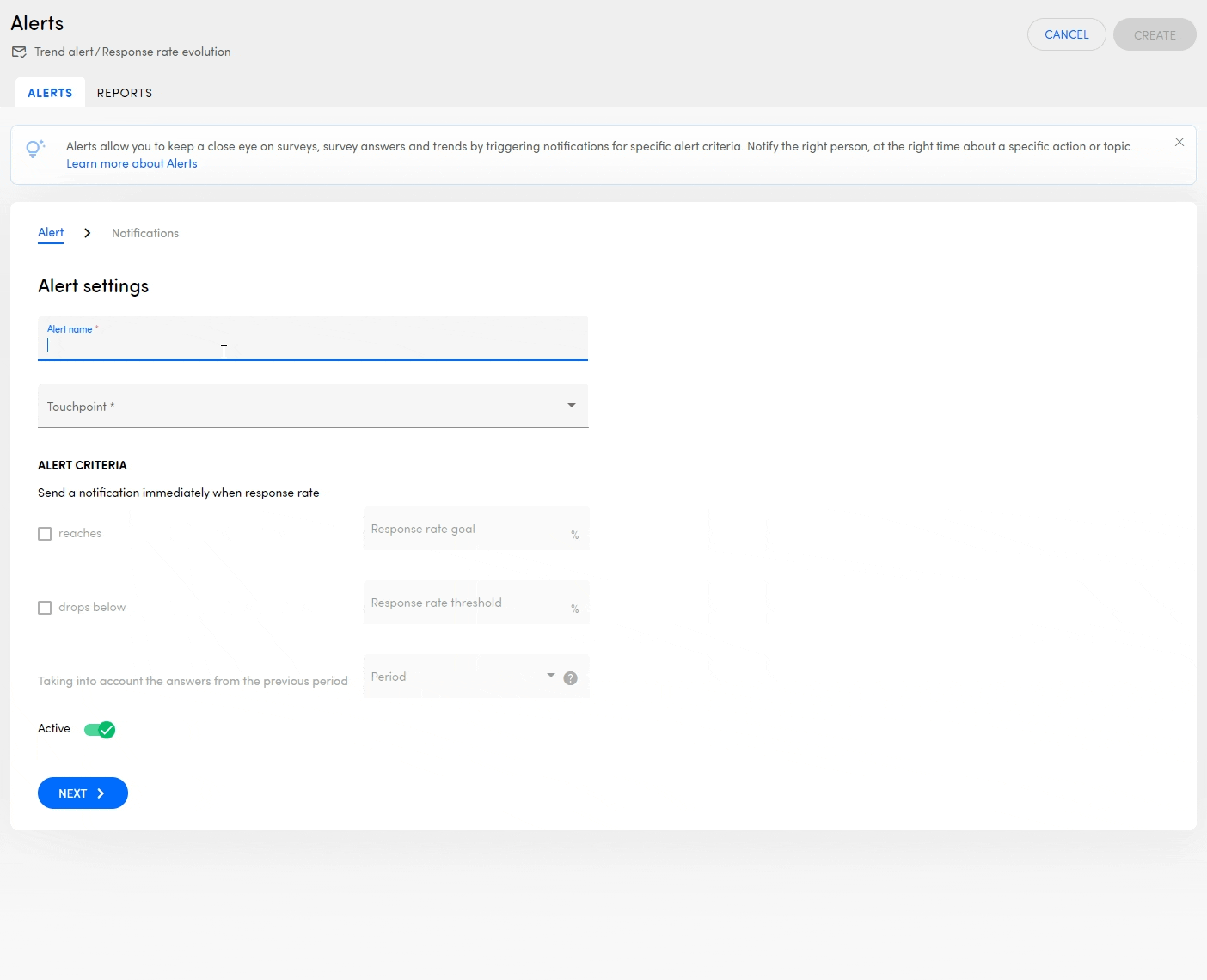 - Specify who needs to receive a notification when the event happens. In the case of a response rate evolution alert, only administrators will be able to receive this notification.