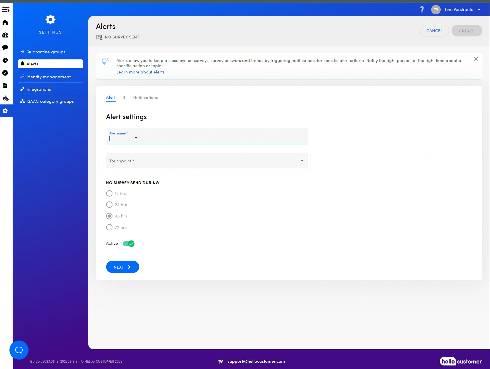 In this case, Tine Admin will receive an alert email if the NPS calculated over the last quarter (= previous three months):