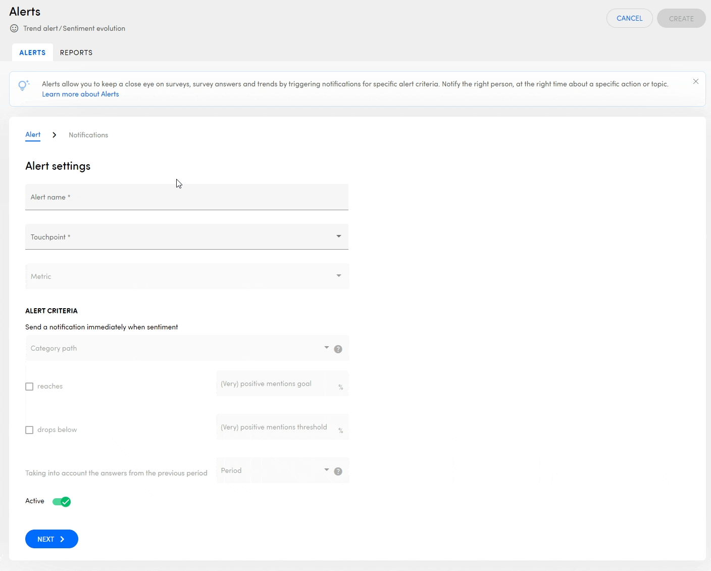 - Specify who needs to receive a notification when the event happens. In the case of a sentiment evolution alert, only administrators will be able to receive this notification.