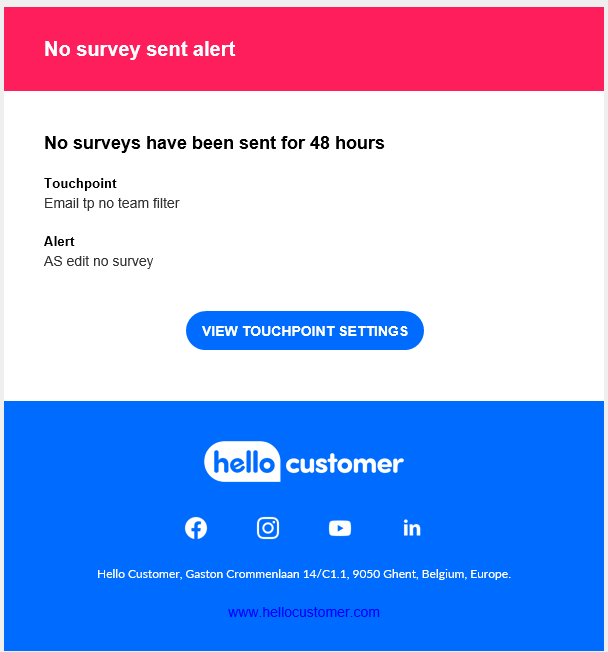 Sometimes, issues may arise where no surveys are sent, without you noticing, To help with this, you can set up an alert that notifies you if no survey has been sent via an e-mail touchpoint during a specified time frame.
