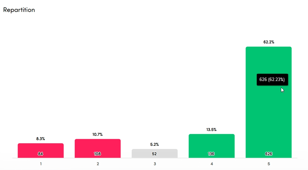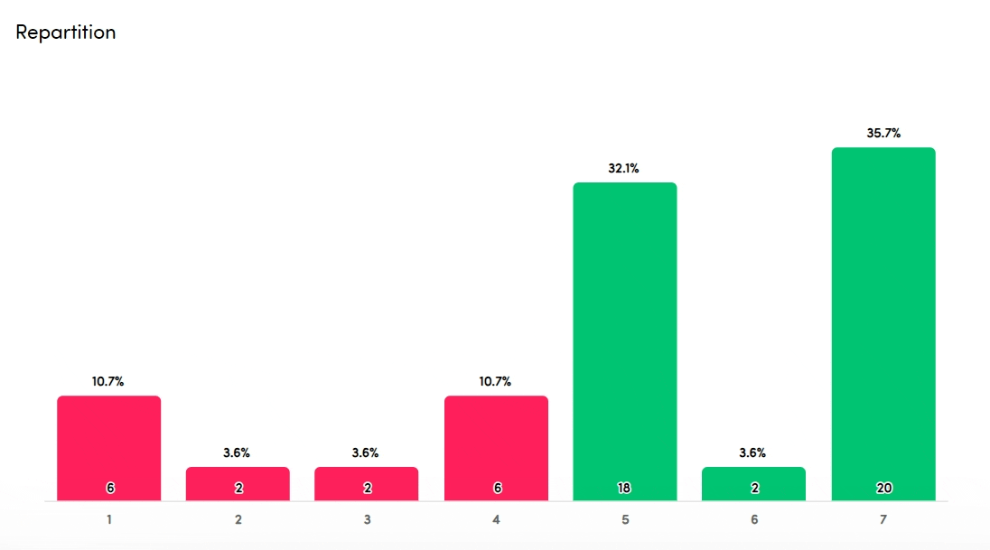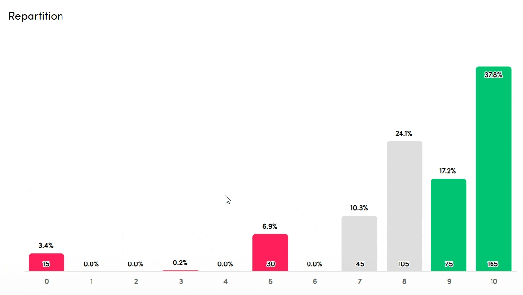 In the repartition, you can see more details about the exact division of the individual scores. For each individual score, you see the exact number of respondents at the bottom and the percentage on top. In case the numbers are too small, they are not shown, but you can always trigger them on hover.