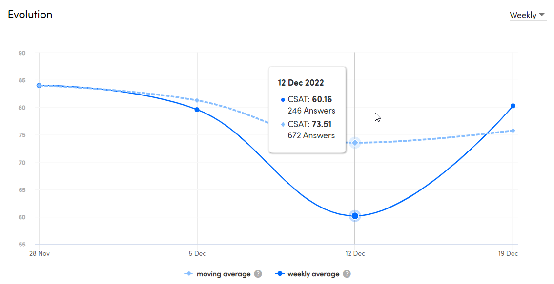 Last, but certainly not least, you can also see an evolution of your CSAT. You can choose whether you want to see this evolution on a daily, weekly or monthly basis. The dots on the line represent the score that is calculated at the end of the chosen interval. For the weekly interval, for example, this is on a Sunday. You can hover your mouse over the dots to see the score and the date of the calculation.