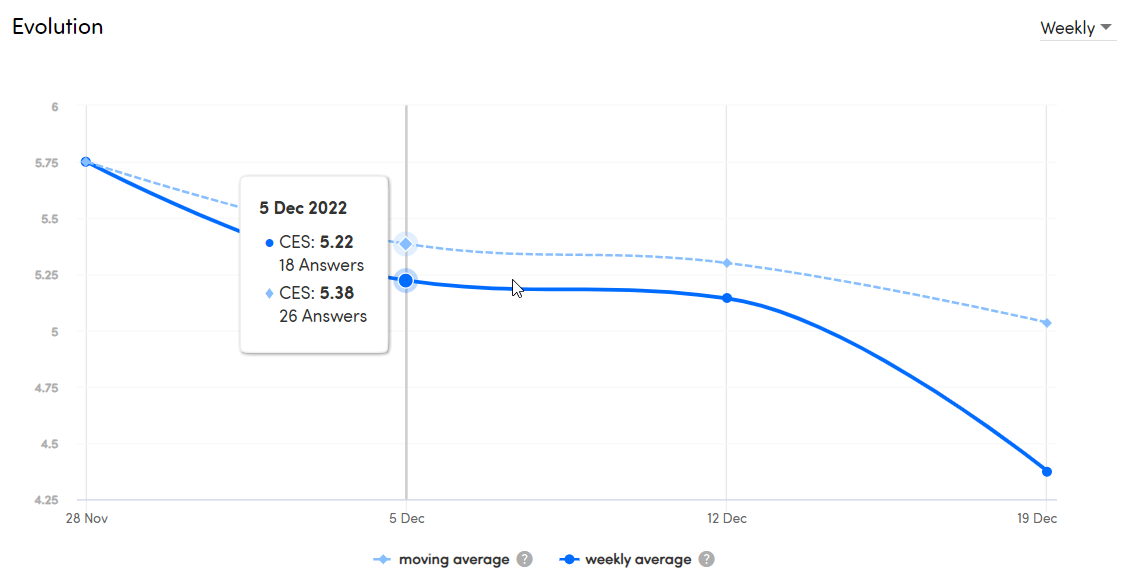 Last, but certainly not least, you can also see an evolution of your CES. You can choose whether you want to see this evolution on a daily, weekly or monthly basis. The dots on the line represent the score that is calculated at the end of the chosen interval. For the weekly interval, for example, this is on a Sunday. You can hover your mouse over the dots to see the score and the date of the calculation.
