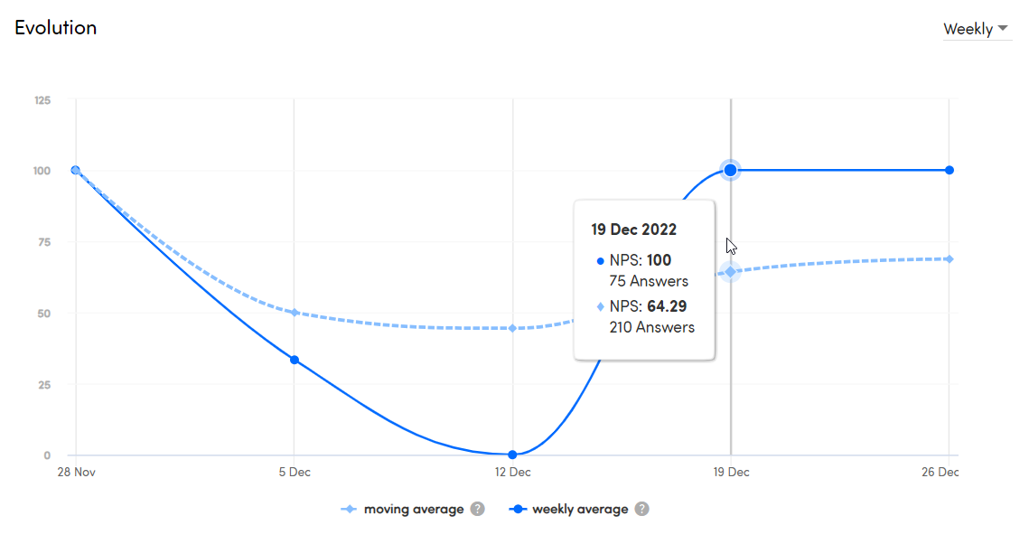 Last, but certainly not least, you can also see an evolution of your NPS. You can choose whether you want to see this evolution on a daily, weekly or monthly basis. The dots on the line represent the score that is calculated at the end of the chosen interval. For the weekly interval, for example, this is on a Sunday. You can hover your mouse over the dots to see the score and the date of the calculation.