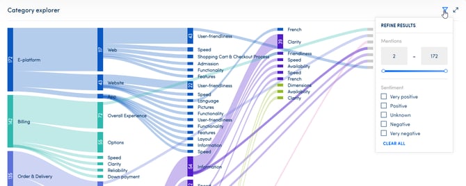 Finally, you can use the slider to filter your data on the number of mentions of the main category. This way, you can remove any main categories with only a few mentions to make the graph less cluttered. You can also filter out multiple sentiments.