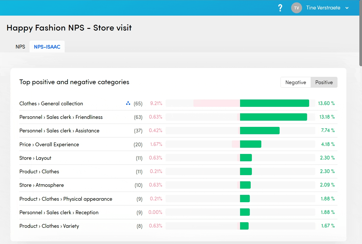 Our AI system, ISAAC, analyses your open text feedback and divides this into categories and sentiments so you can quickly see what your customers are talking about.