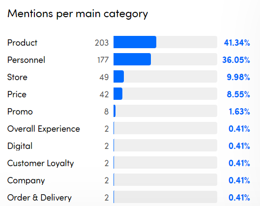 The mentions per main category show you the overview of main categories that are mentioned in the feedback. The main category is the first part of a category path. These group the feedback in more general categories. Take into account that only the 10 main categories with the most mentions are shown.
