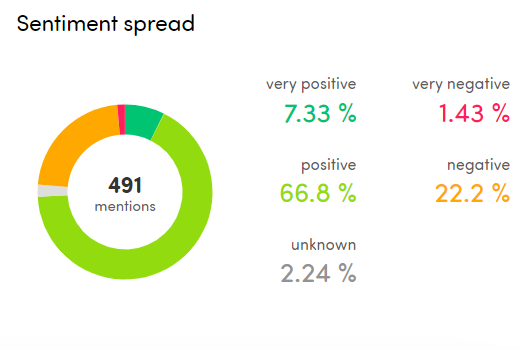 In the example below, the total number of mentions is 491, of which 7,33% is very positive, 66,8% is positive, 22,2% is negative, and 1,43% is very negative. Overall we can say that customers are positive about the interaction discussed in this touchpoint.