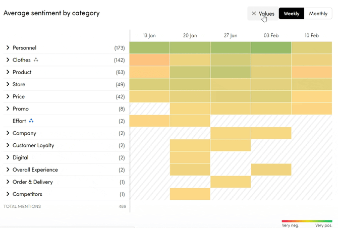 By calculating the average sentiment like this, each positive mention moves the overall average up a bit and each bad mention moves it down, but a category with only a few scores will not rank extremely high or extremely low. You can show the exact average in the graph by clicking "values" (see above).