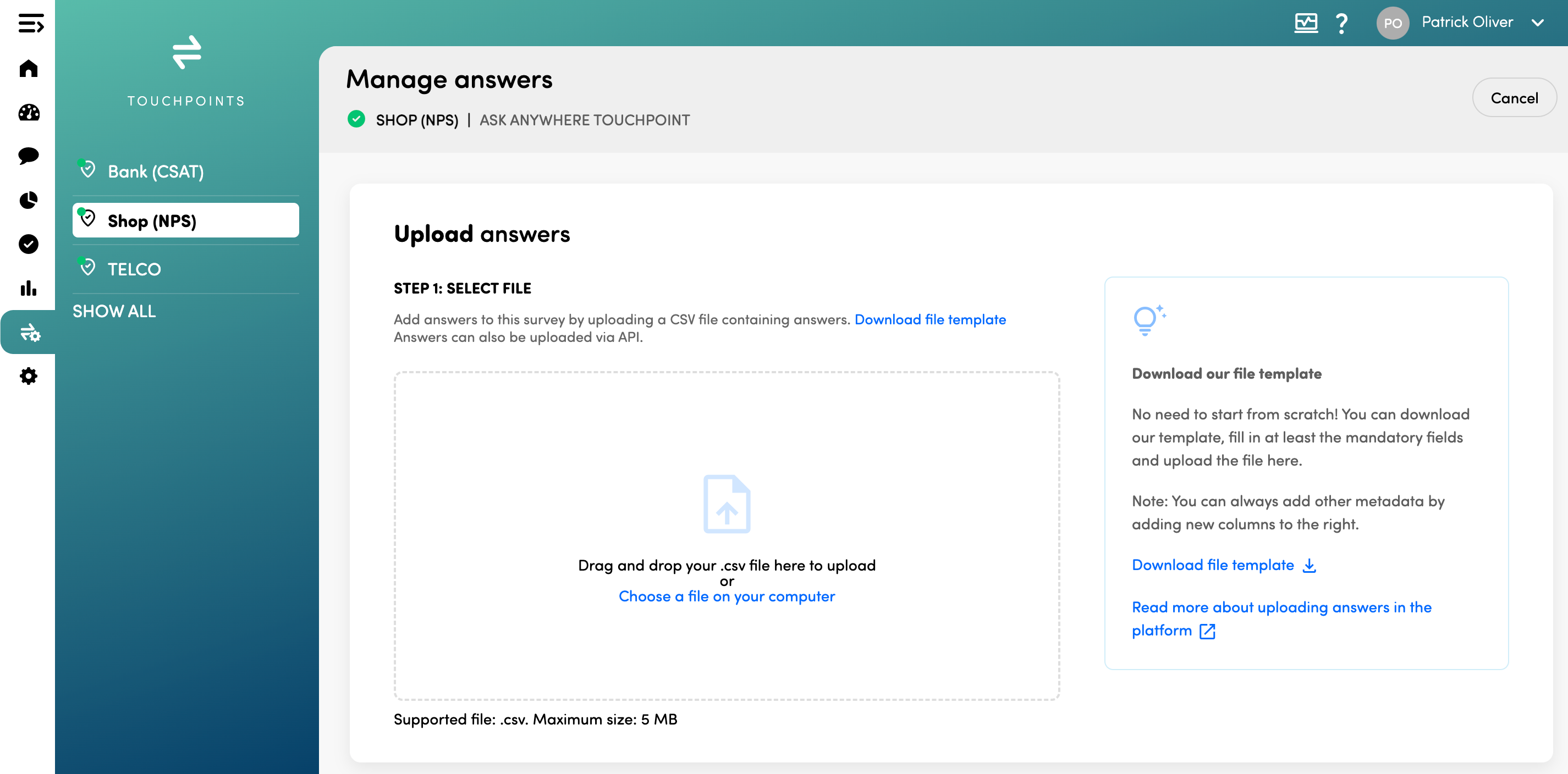 Before starting the upload, download the template. Please note that this template is touchpoint-specific since it contains all questions, part of this specific touchpoint.