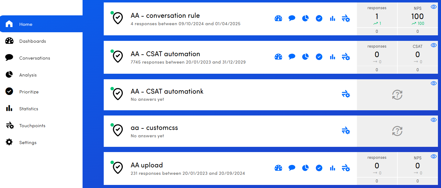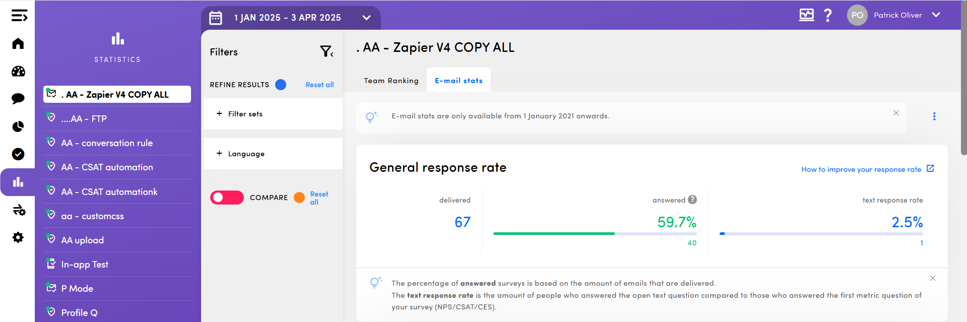 The amount of answered on the e-mail stats page can differ from the amount of answers in other parts of the platform like analysis and conversations for the same date range. This is because on the e-mail stats page, the answered are shown on the date the people received the e-mail and in the other parts of the platform on the date the people filled out the survey. That way, you can easily compare the response rates of the different batches of surveys that were sent.