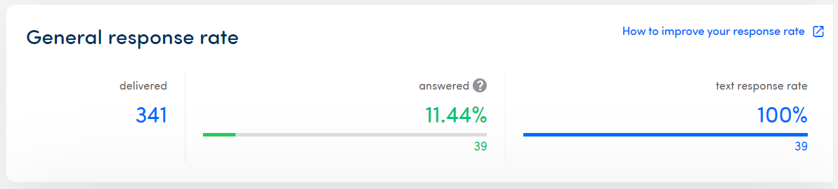 - Text response rate = the amount of people that left an open text answer compared to the total amount of people that answered the survey