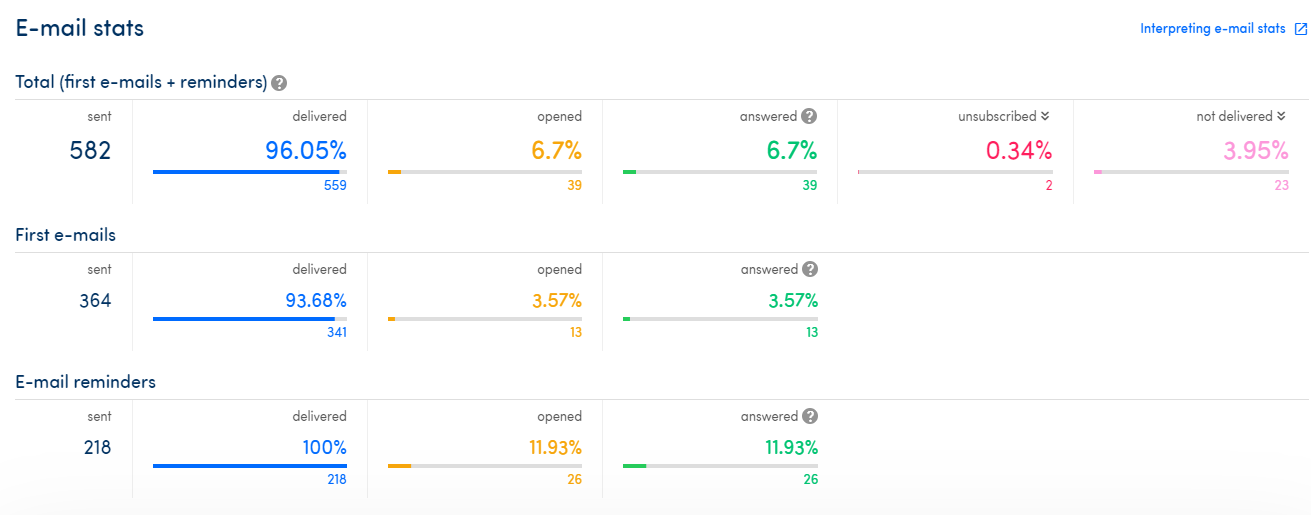 In the e-mail stats overview, you can find all details regarding your sent surveys. Of course, this is only available when you send your survey invitations through Hello Customer, or in other words, for Email touchpoints.