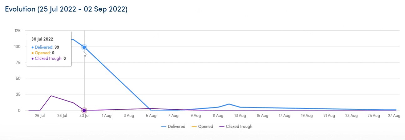 In the evolution graph, you can see on which days the respondents performed different actions. In these graph, all actions are shown on the date they were performed and not on the date the e-mail was sent, like in the e-mail stats in detail.