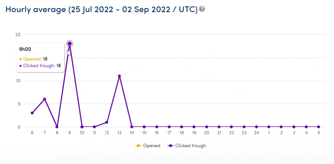 In the hourly average, you can see the actions performed with the e-mail per hour of the day. This can help you to decide on the best time to send your e-mail to your respondents.