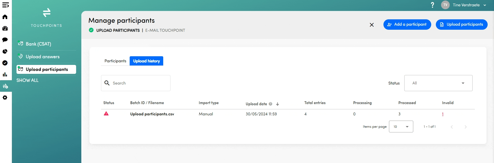 Uploading participants is only possible for e-mail touchpoints, not for Ask Anywhere and , Website and In-app touchpoints. Learn here how to choose the best touchpoint type for your use case.