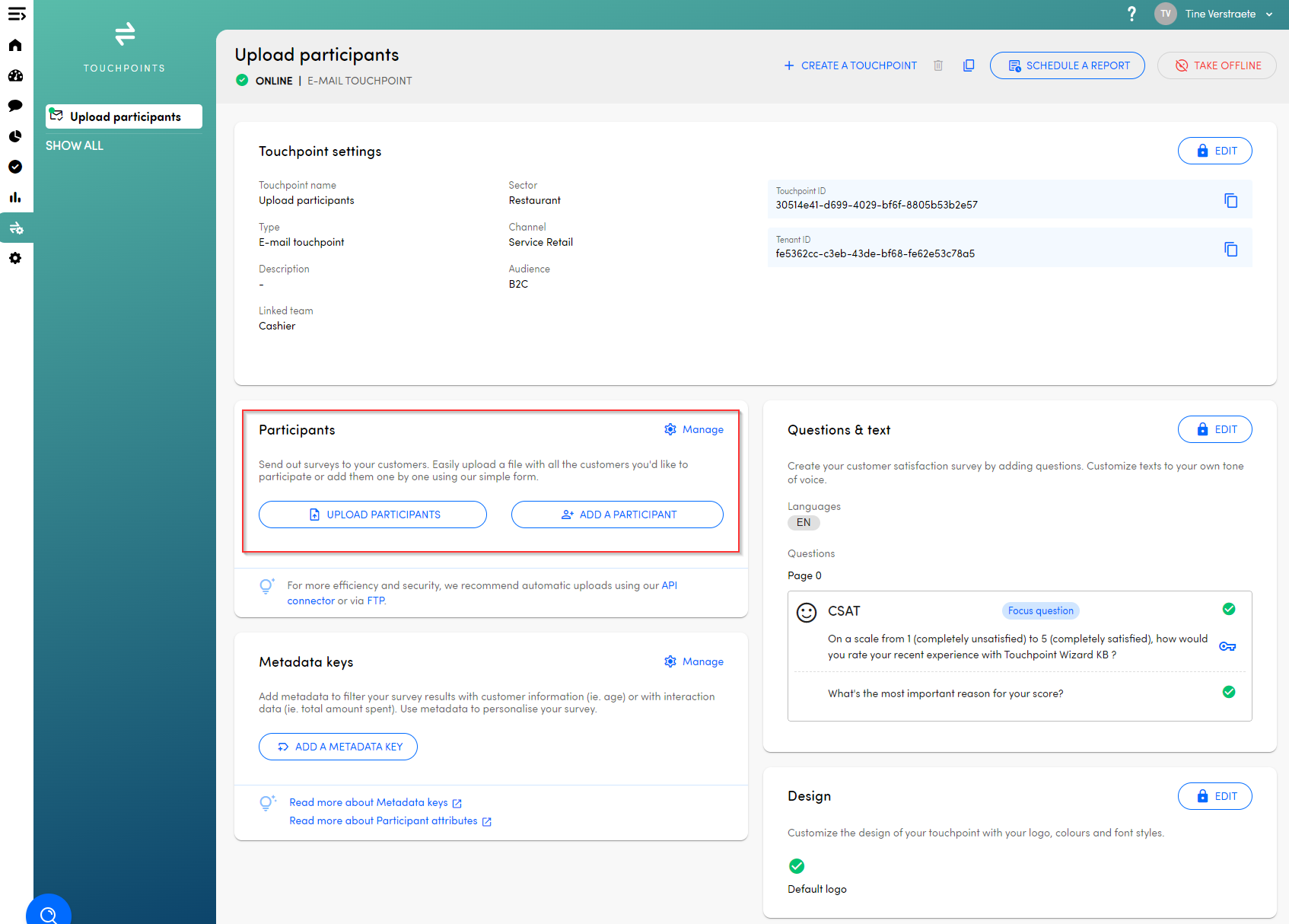 Getting your survey to the participants (your customers, the employees within your company, etc.) is a very important step to get results in your touchpoint. After uploading the participants, the uploaded participants will receive an e-mail invitation and will be able to fill out the survey.