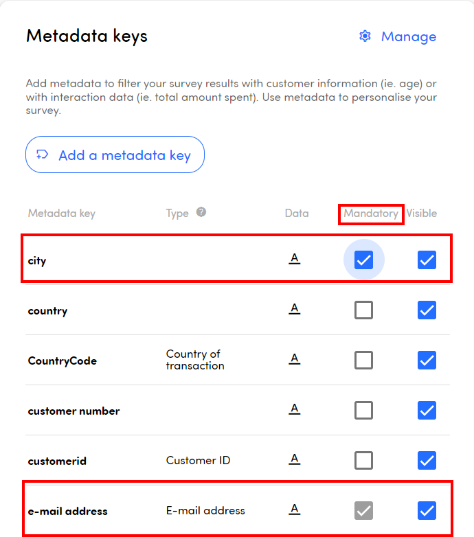 Optional metadata can become mandatory by selecting the option on the Metadata keys section of the touchpoint settings. When they become mandatory, they have to appear on the .csv files as columns (preferably with the same name as the metadata key they will be associated) or be associated to one of the columns present on the file.