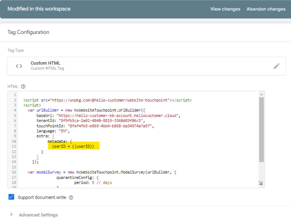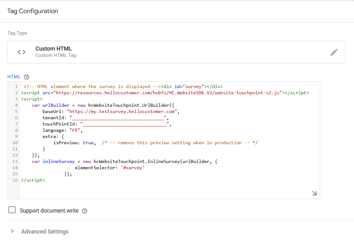 3.5. In the Custom HTML section, you can copy paste your script. Make sure to disable the 'IsPreview: true' and to enable the modalSurvey.show() or inlineSurvey.show()