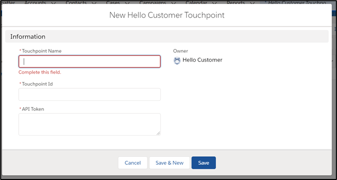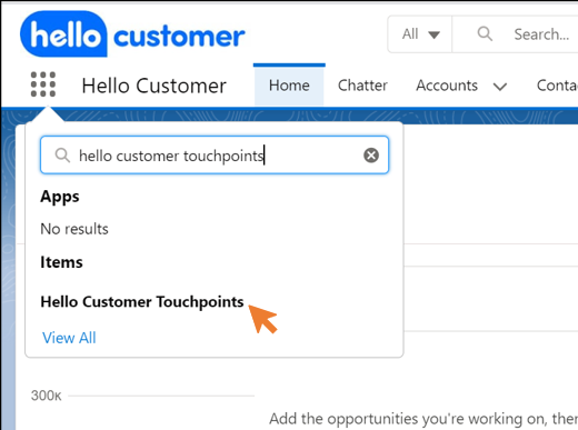 - After having installed the package, you can navigate in SFDC to “Hello Customer Touchpoints”: