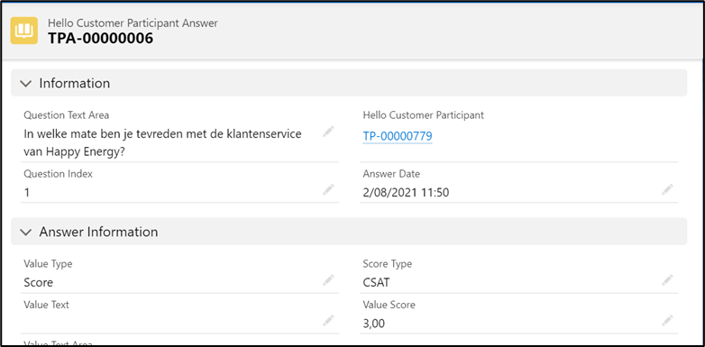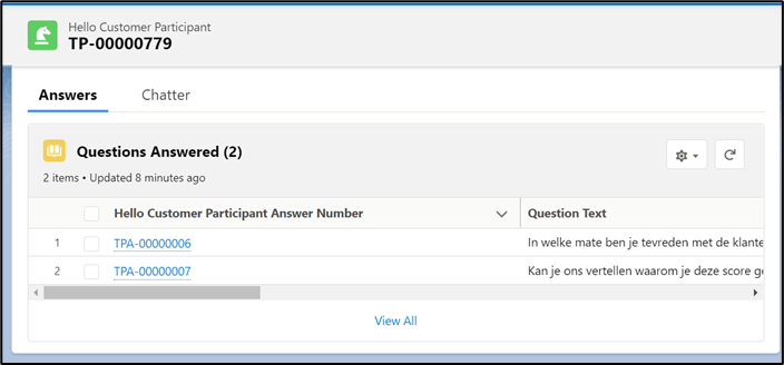 Under the ‘Hello Customer Participant’, you can find the ‘Hello Customer Participant Answers’. These answers are the open text feedback and the scores given by this specific participant/respondent. You can also see what type of question was asked.