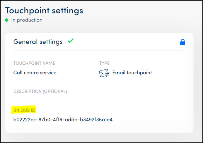 To find your touchpoint ID, you can navigate to Touchpoint Settings in Hello Customer for your touchpoint and select the Unique ID in General Settings: