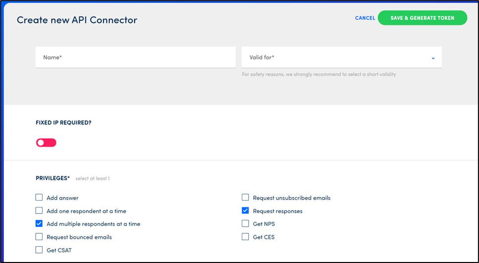 Make sure that ‘Add multiple respondents at a time’ and ‘Request responses’ are enabled! Otherwise the connector will not be authorized to work in the 2 directions. After setting up the API connector, you can click ‘Save & Generate Token’ which will generate you the API token needed in SFDC.