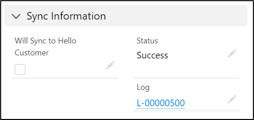 Will Sync to Hello Customer is a field that triggers the API call. Whenever an event in SFDC needs to trigger the sending of a survey, this event will need to check this box. After the sync, this box will be unchecked again and the status of the sync to HC will appear in the ‘Status’ field. This will either be Success or Failure and the logs of this sync can be consulted in the ‘Log’ field.