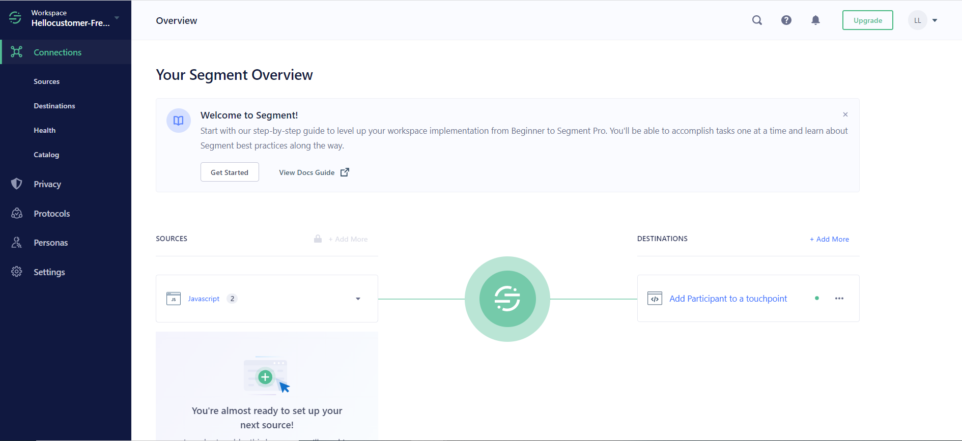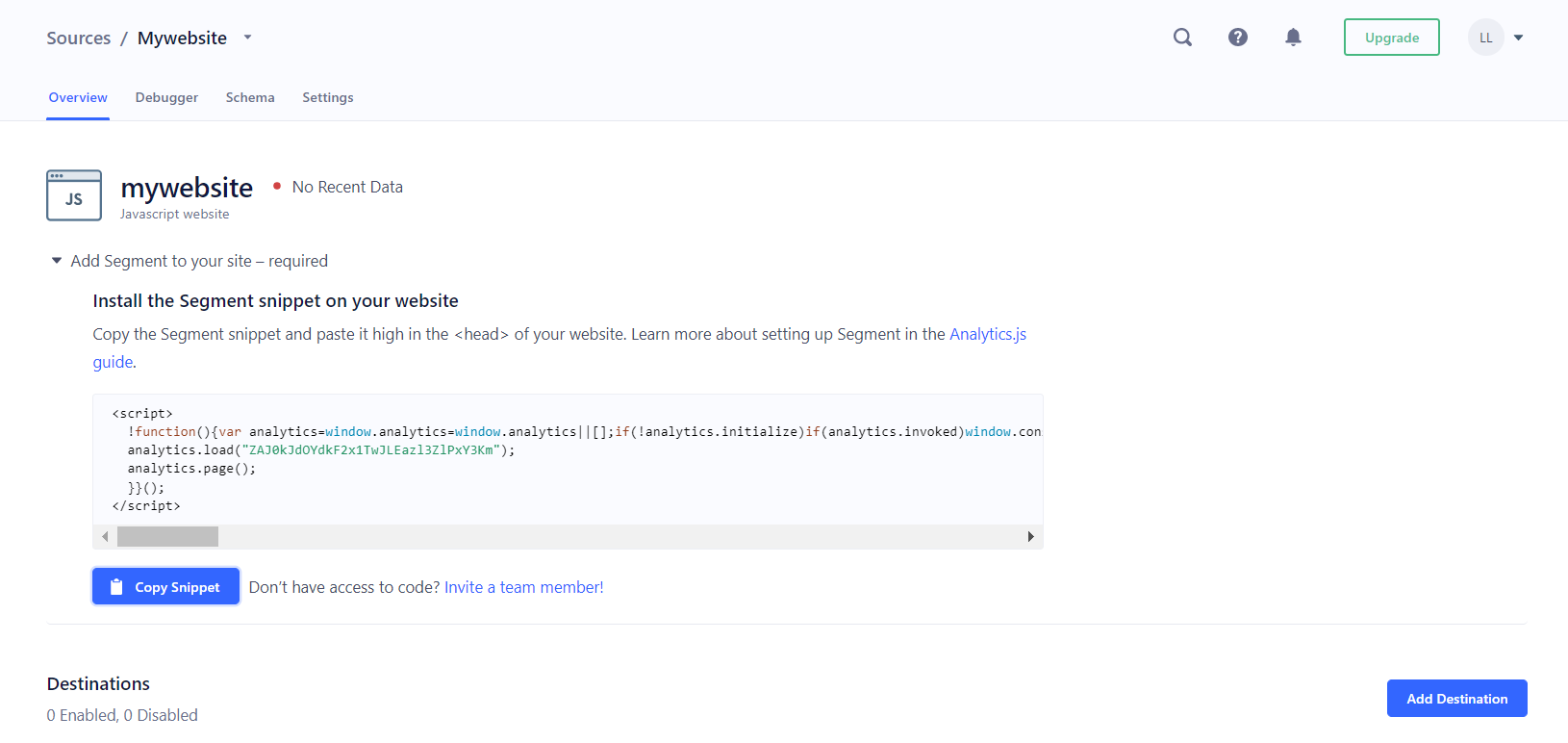 Once Segment has been installed, you can start with setting up your source. This can be a lot of different options, but in this example a website has been selected. In order to install Segment the below snippet was copied and pasted in the website HTML.