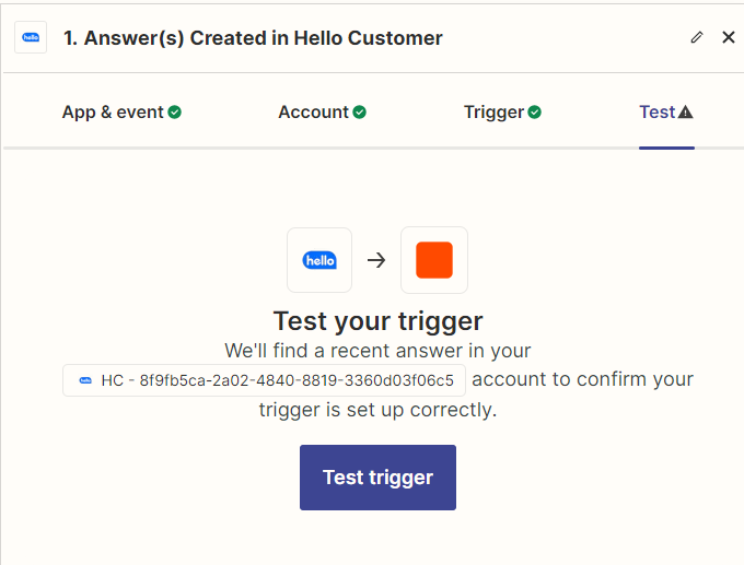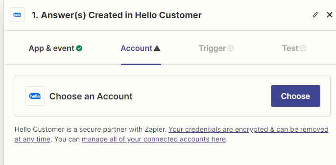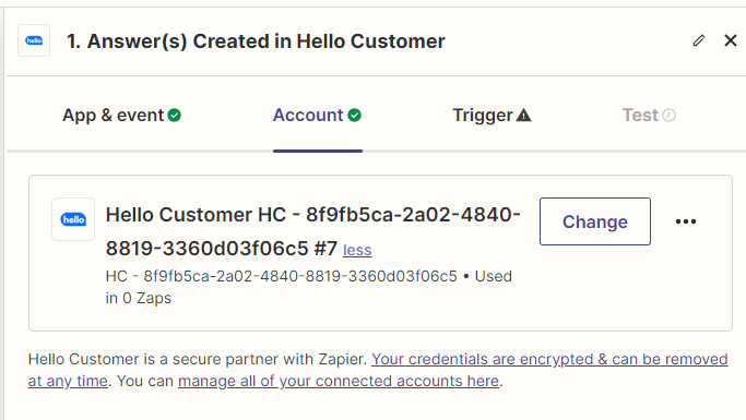 After clicking the button to continue to Hello Customer, you will have connected Zapier to your Hello Customer account: