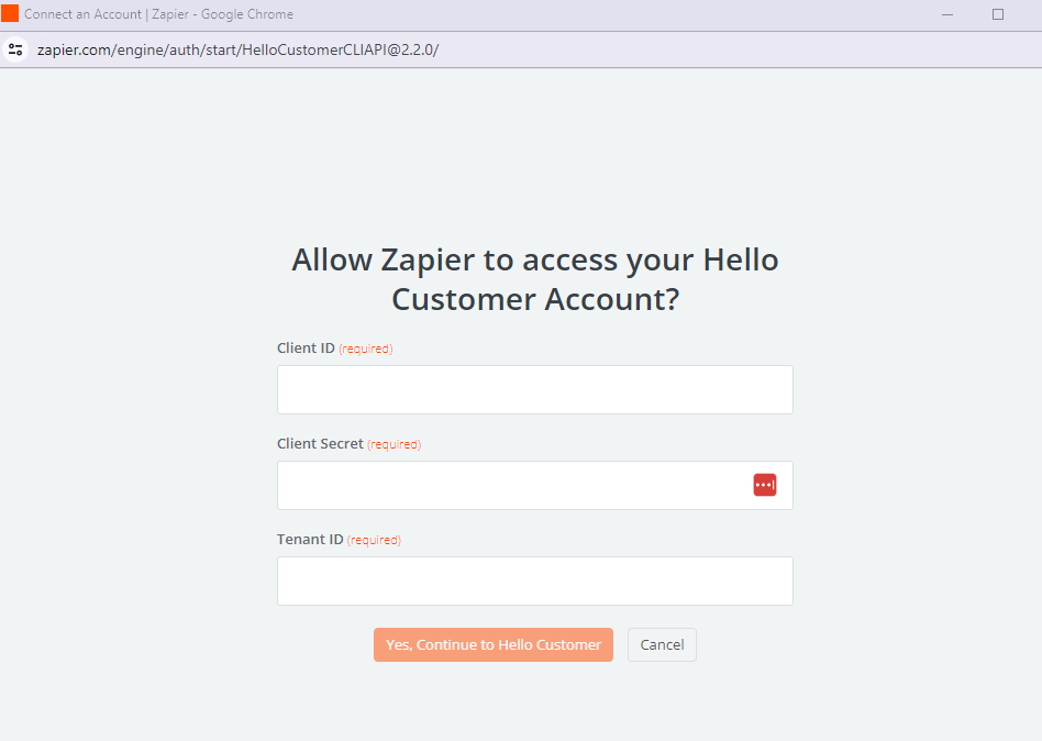You will get a screen where you can give Zapier permission to access your Hello Customer account. Enter your Hello Customer tenant ID and the client ID and client secret that you copied earlier: