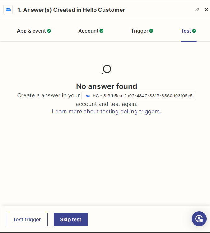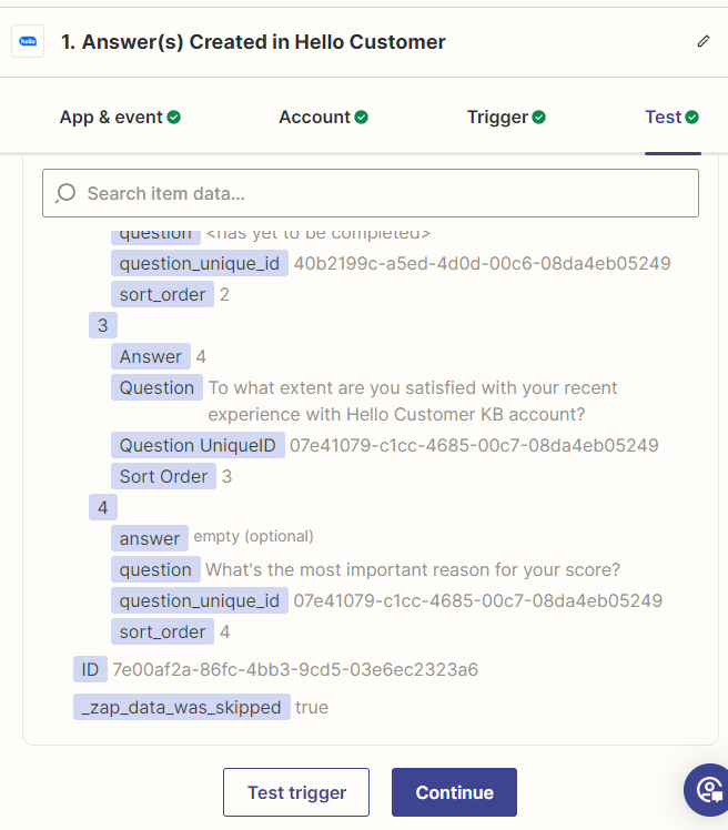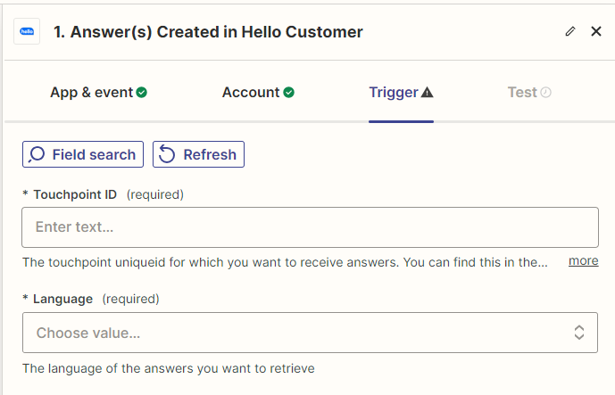 As an example of how to use the Hello Customer integration in Zapier, we will configure a Zap that triggers when new answers are received for a touchpoint, and then performs an action in one of the 5000+ integrations in Zapier.