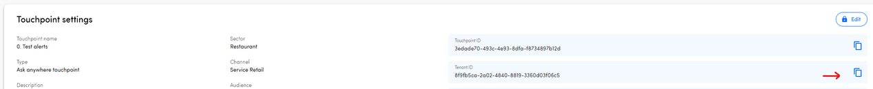 - You will also need your tenant ID and the touchpoint ID for which you want to setup your Zap. You can copy both ID’s from the touchpoint settings:
