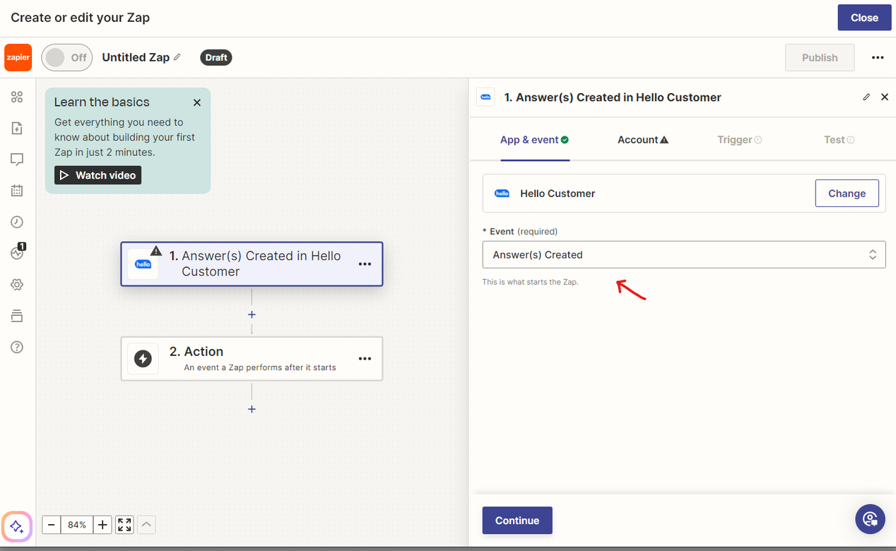 Of course, you can easily create a Zap yourself! Just select a trigger that will start your Zap, and an action that the Zap will perform. One of those should be the Hello Customer integration.