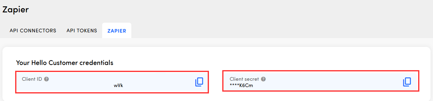 The Client ID and the Client Secret can be found on Hello Customer platform, by accessing the Zapier feature on Settings > Integrations