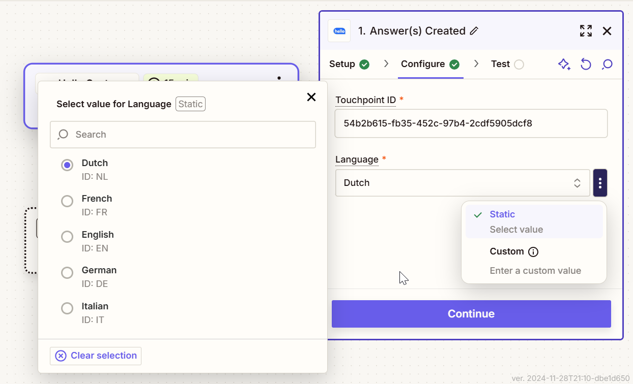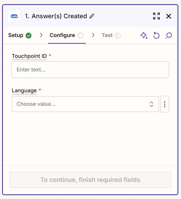 The next step is configuring the touchpoint and language/languages of the answers retrieved from Hello Customer.