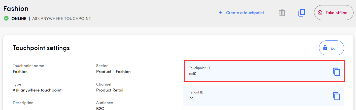 The Touchpoint Id can be found on the Touchpoints section, going to the specific touchpoint from which to retrieve the answers: