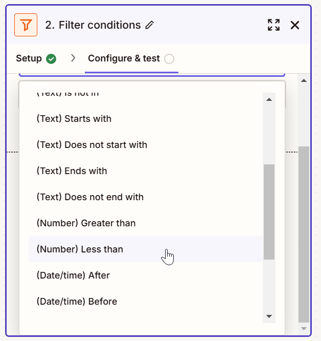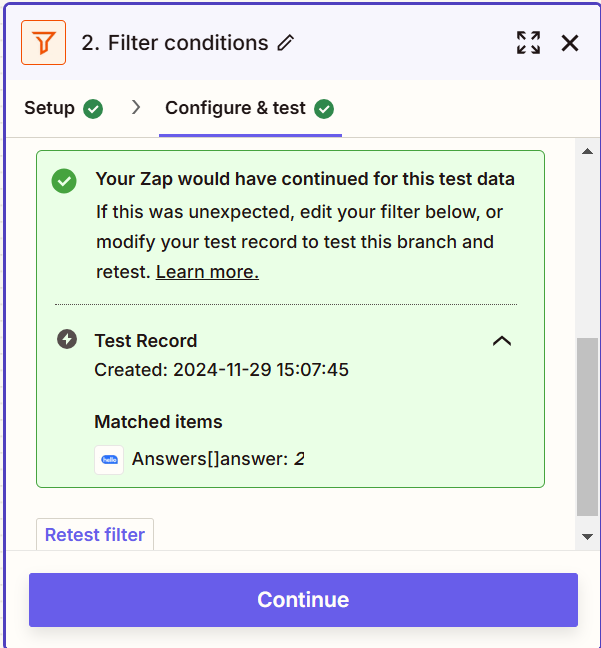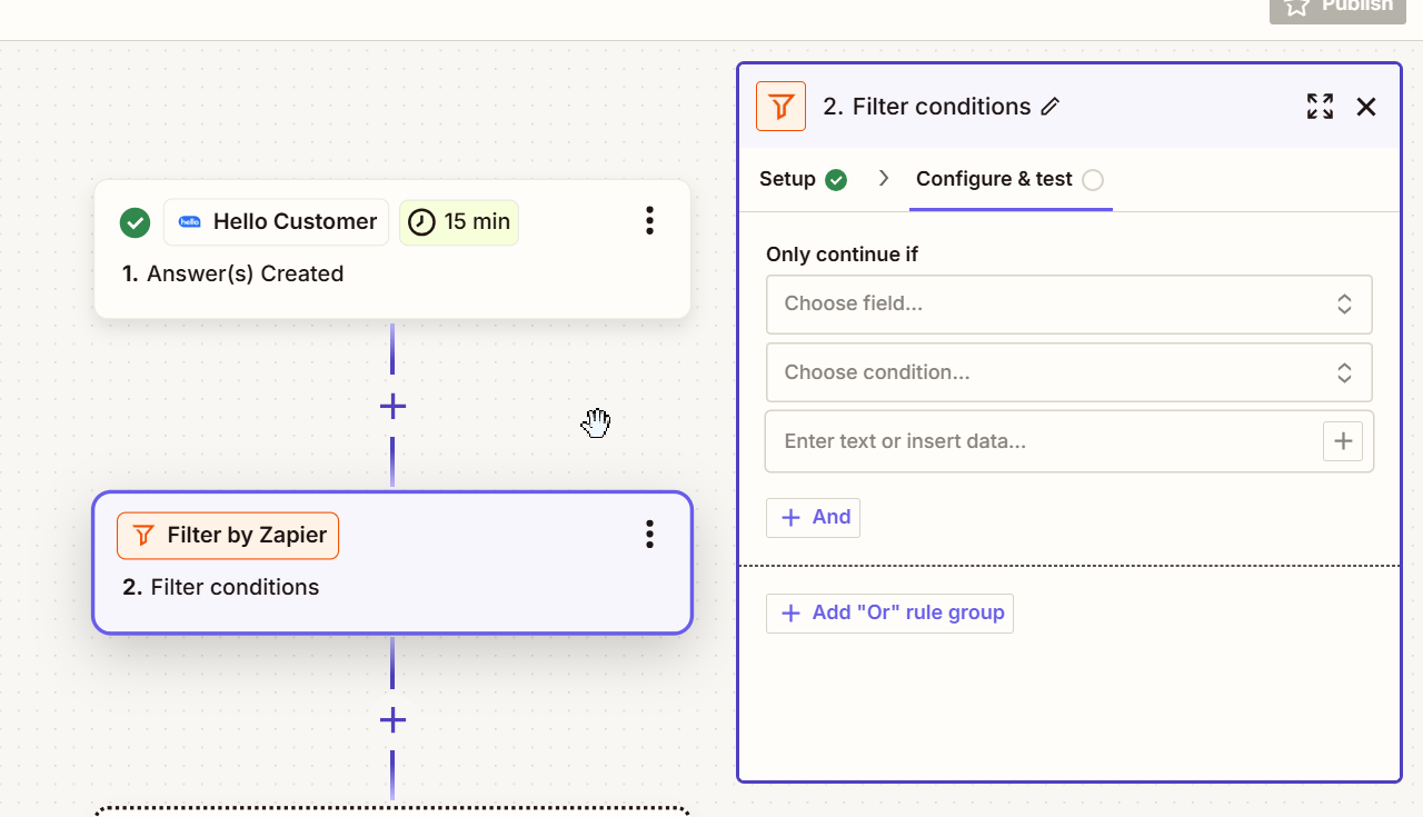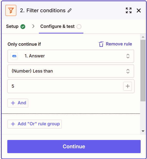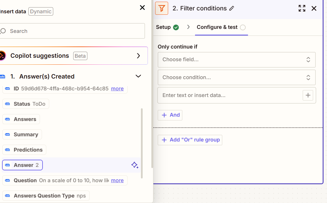 Filters require conditions to determine which responses qualify to trigger an action. These conditions prevent responses that don't meet the specified criteria from initiating the action. To do so, A field from the answer, a condition and a text or data has to be configured.