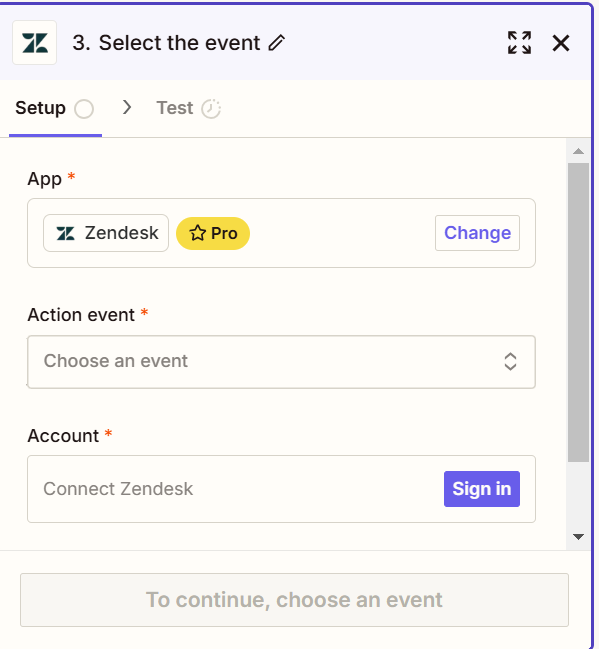 Once selected, the action has to be configured. To do so an event has to be selected and Zapier needs to be connected to the Zendesk account.