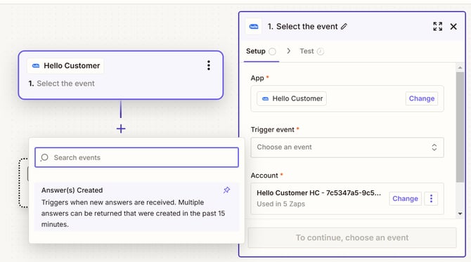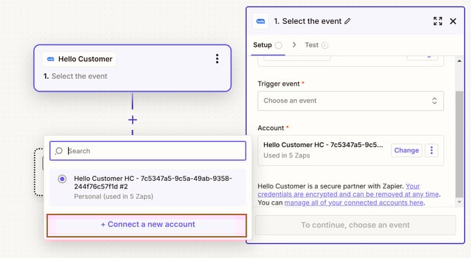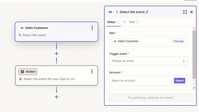 Once selected, a Setup dialog box appears, which is used to select the trigger event and the connect to the Hello Customer account.