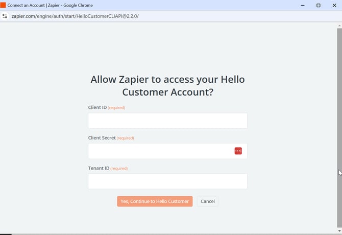 A new widow will appear asking for the Hello Customer account credentials (Client ID, Client Secret, and Tenant ID).
