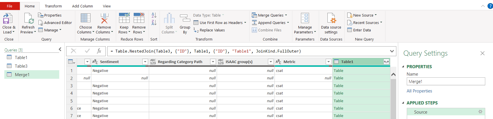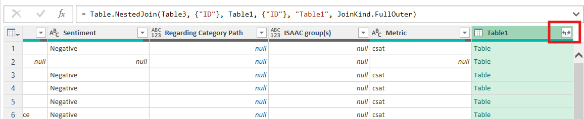 - Once the data is merged, you may notice a column containing nested tables from the ISAAC categories.