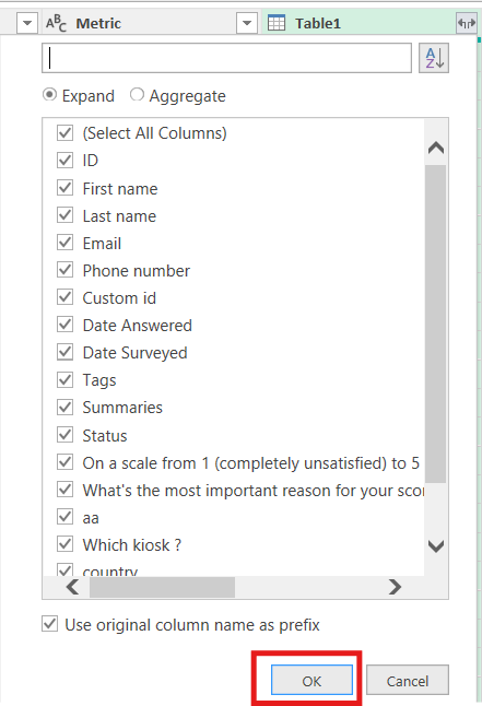 - Click on the expand icon in the top-right corner of the column to expand the categories into individual columns.
