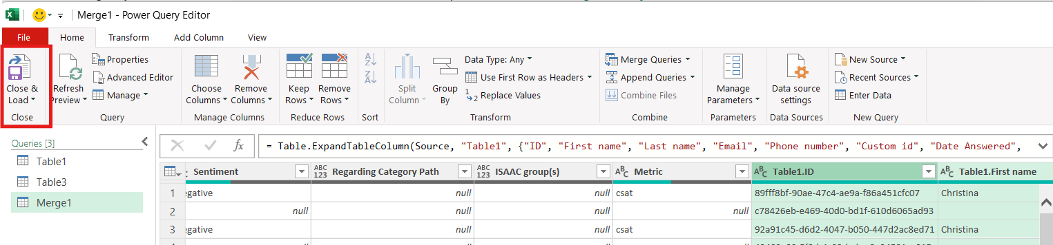 - After reviewing the merged data, click Close & Load to finalize the merging process and return the data to a new sheet in the same file.