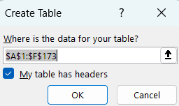 - Ensure the checkbox for My table has headers is checked, then click OK.