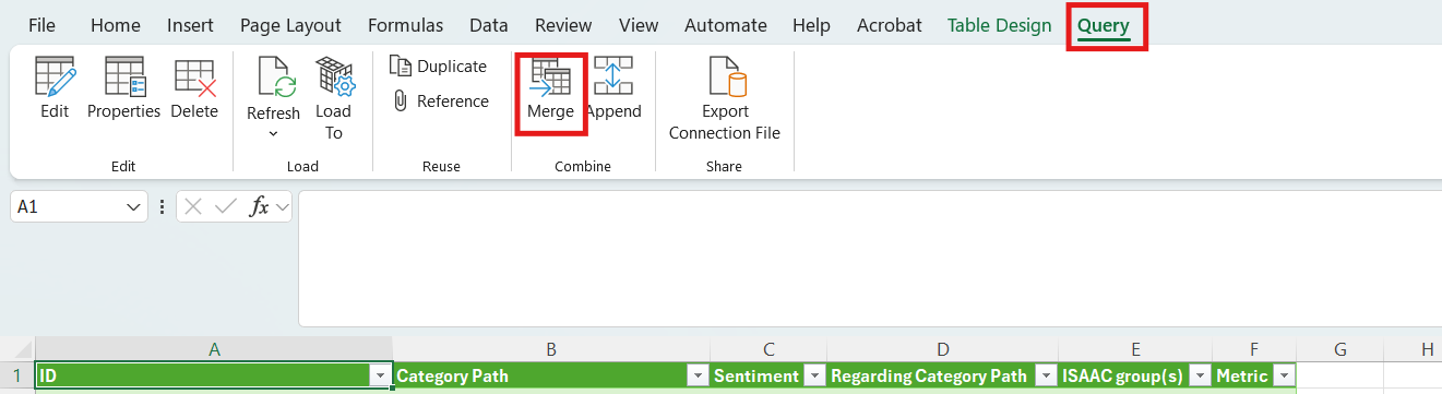 In order to merge the data from the "Answers" export (containing all answers and metadata per respondent) with the "Isaac" export (containing all categories per respondent), follow these steps to ensure that the Isaac categories are linked correctly to the feedback data for analysis.