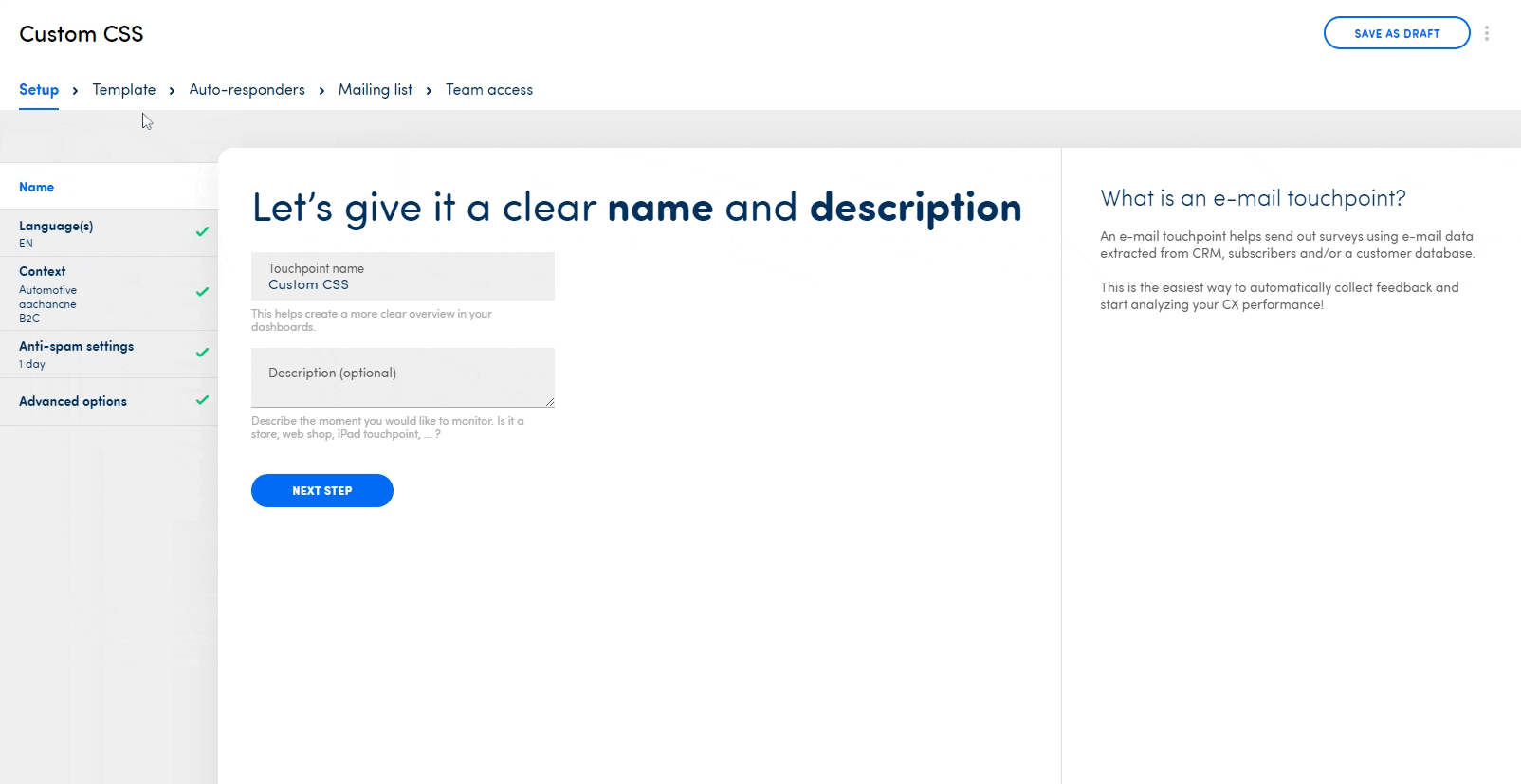 Custom CSS can be found both in the touchpoint set-up wizard (which opens automatically when you add a new touchpoint) and in the touchpoint settings.